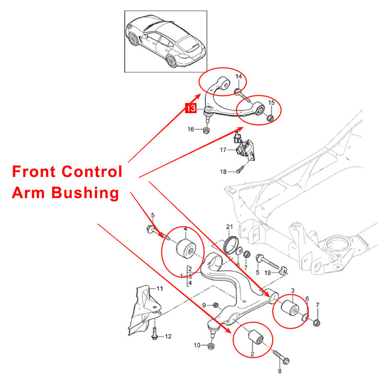 Tuno tootja Hiina tehas tarnib Porsche Panamera 2014–2016 eesmise ülemise ja alumise juhthoova puksi komplekti, OE